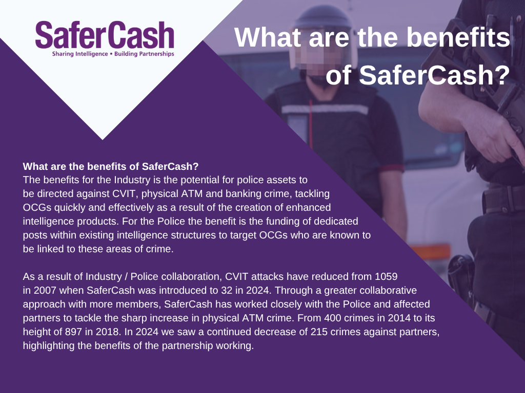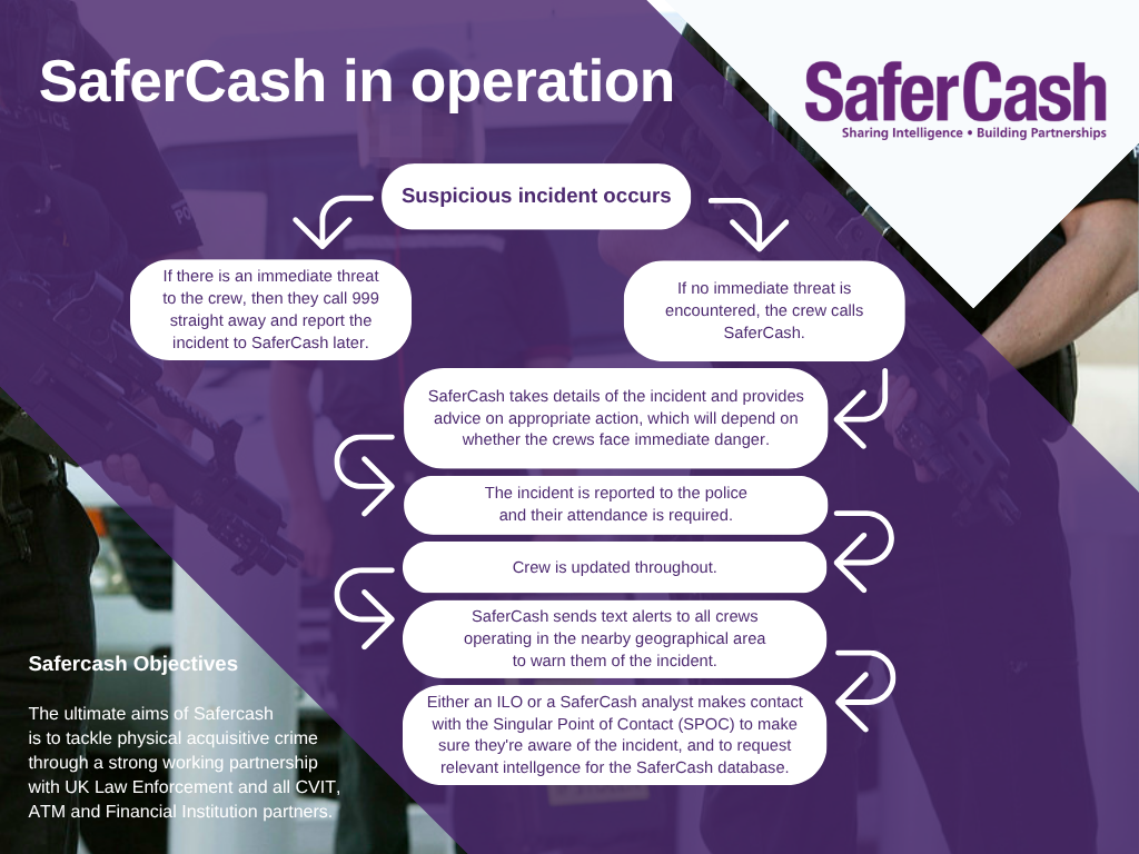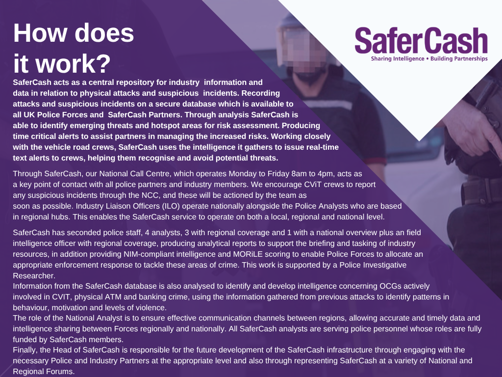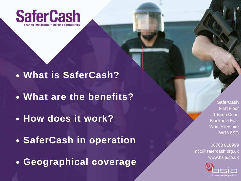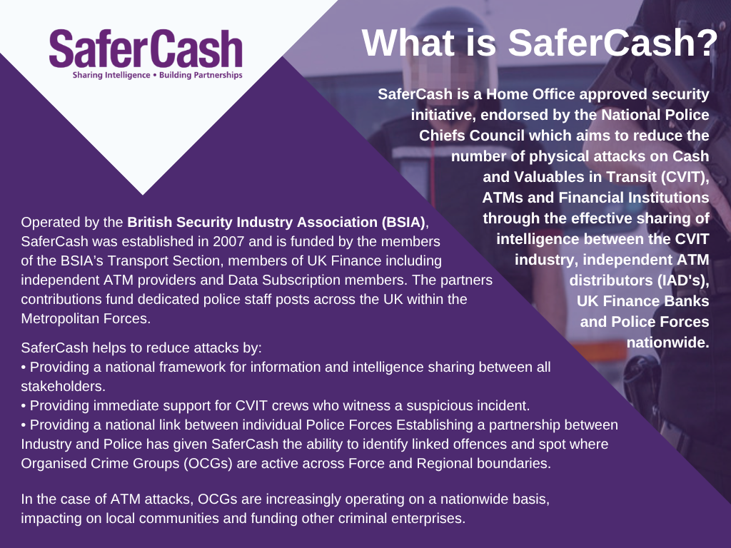 SaferCash, an initiative operated by the British Security Industry Association, offers numerous services that are aimed at reducing attacks on Cash and Valuables in Transit (CViT) couriers, against Financial Institutions, including their ATM estates, and crime against Data Subscription Members nationwide. Services include: